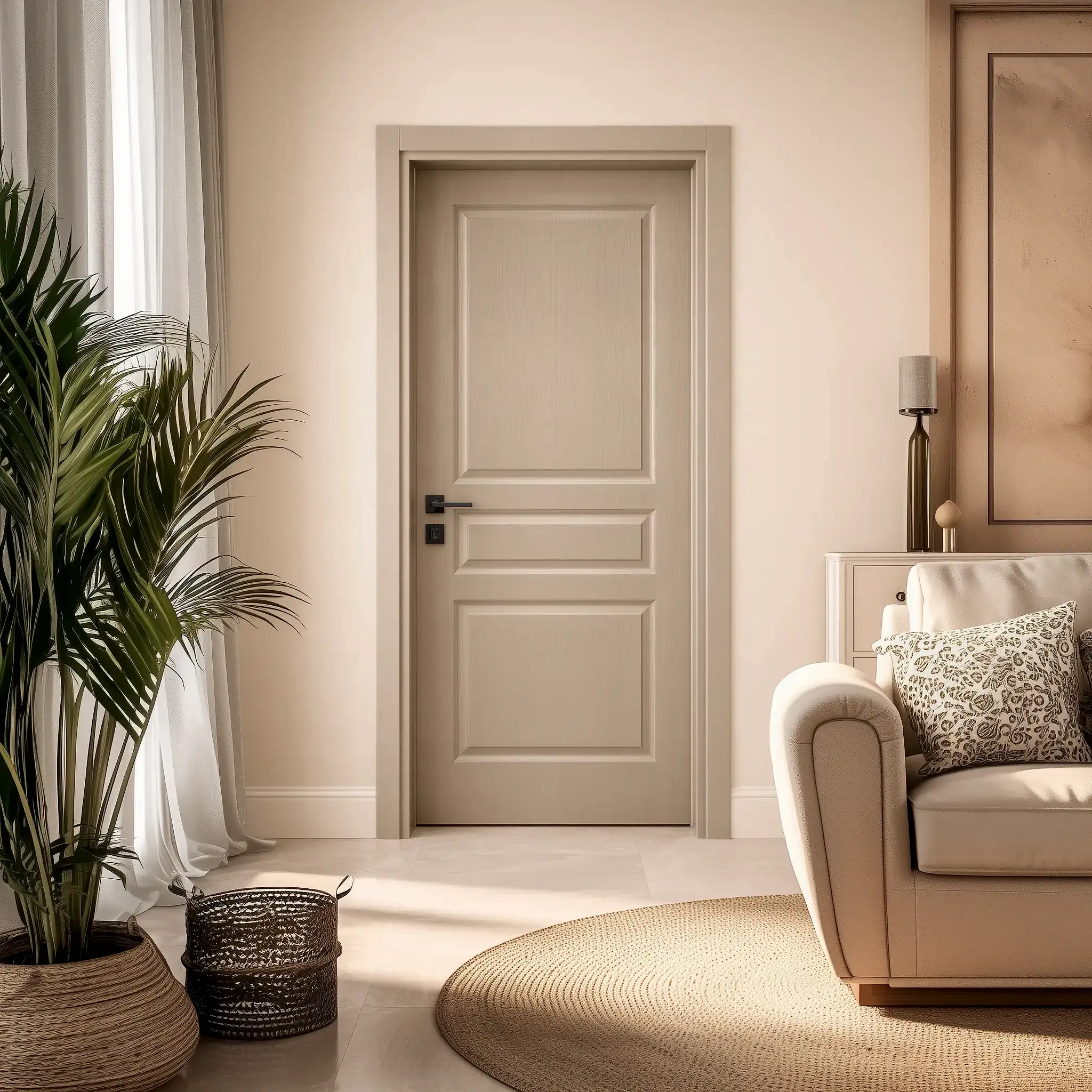 Kapının yüzeyi, kolay temizlenebilir özelliği sayesinde pratik kullanım avantajı sağlar. Aynı zamanda panel yapısının sunduğu derinlik, ışık ve gölge oyunları oluşturarak mekâna daha zengin bir görünüm kazandırır.
